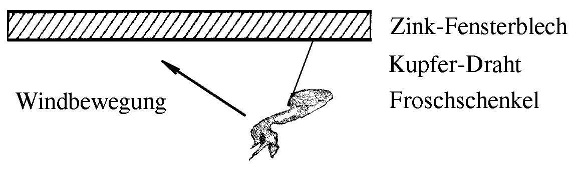 Galvani hatte Froschschenkel an Kupferdrähten befestigt und diese an seinem Fensterbrett, welches aus Zinkblech bestand, aufgehängt. Durch einen Zufall beobachtete er, wie sich die Froschschenkel in dem Moment mit einer zuckenden Bewegung zusammenzogen, wenn sie angetrieben vom Wind das Zinkblech berührten. So wurde die Wirkung des elektrischen Stromes auf lebendes Gewebe wiederentdeckt. Abbildung 3 zeigt diese Anordnung.